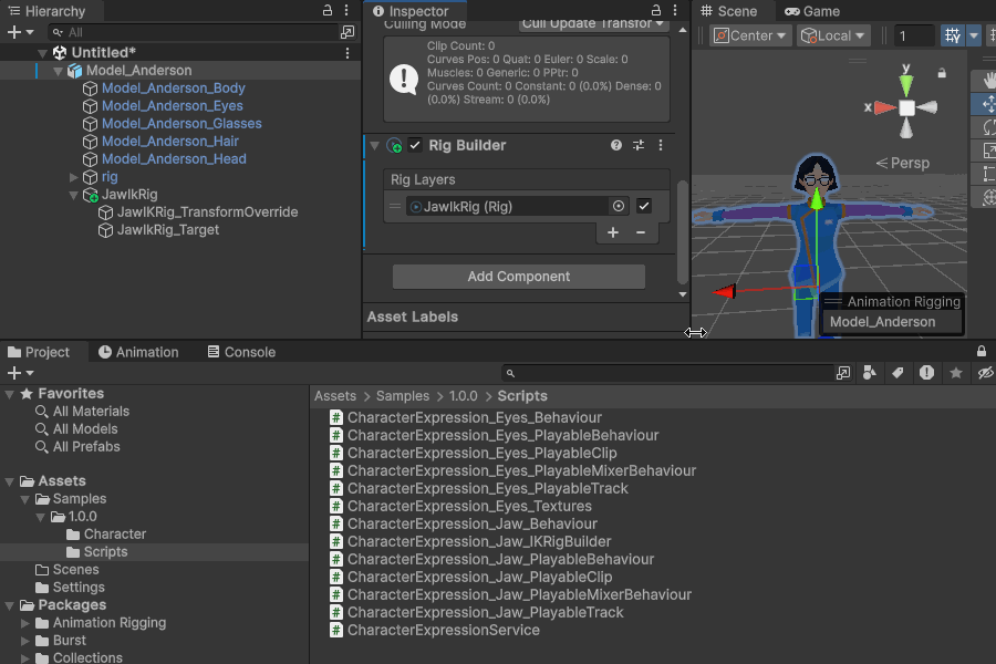 The purpose of this package is to assist animators from animating expressions and talking by hand. This package includes two systems for animating character expressions. One for animiating the jaw and one for the eyes. This package contains behaviours, playables and utilities for controlling eye and jaw expressions.