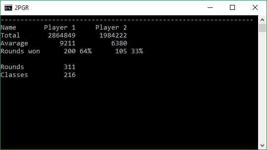 Two Player Game Results CSV Scoreboard sample: Player 1 Player 2 1.Score 1.Score 1.Class 2.Score 2.Score 2.Class 3.Score 3.Score 3.Class ... ... ... Tested with Windows 10 and Linux Mint