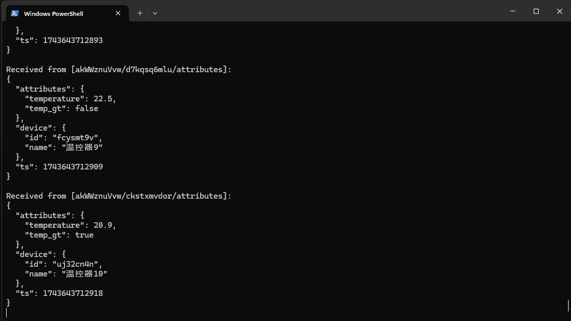 示例中订阅了所有设备的属性更新消息,您也可以根据实际需求修改订阅的主题。