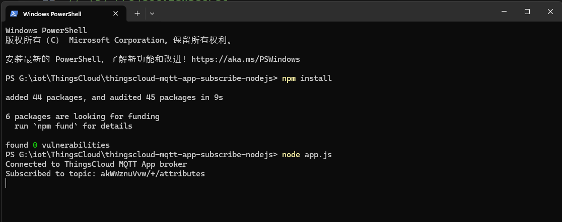 该示例代码展示了如何使用 ThingsCloud MQTT 应用端订阅服务,通过 NodeJS 语言实现订阅设备消息的功能。