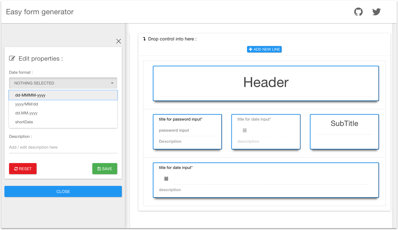 IMPORTANT: easyFormGenerator v2.1.1 introduced a breaking change to fix angular formly upgrade compatibility issue. This breaking change impacts Header control only. Header control field model now needs header value to be in