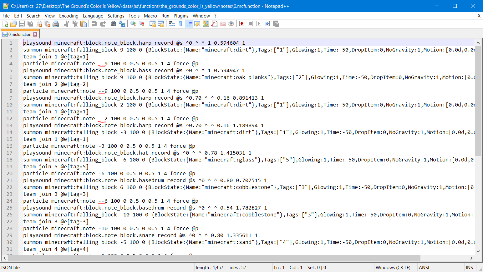 Using the "piano roll" visualizer, some particle commands have a "double negative" in them, which is most likely a typo or a coding problem, and it causes the entire mcfunction file to not load in game. For example: instead of particle minecraft:note -9 100 0 0.5 0 0.5 1 4 force @p