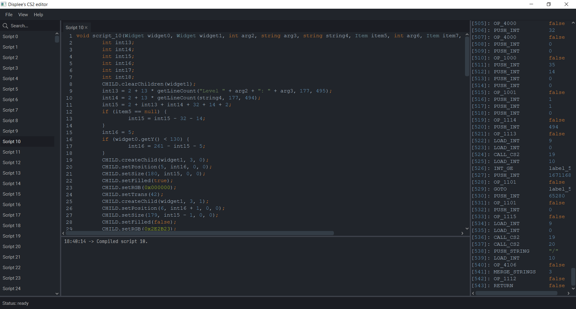 This is an attempt in creating a simple editor for Vincent's CS2 compiler/decompiler. There is also support for viewing the assembly of the script.