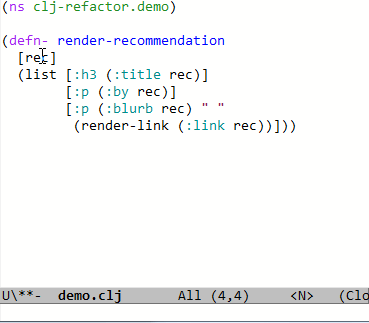 I place the cursor on rec inside [rec] and do cljr-destructure-keys: