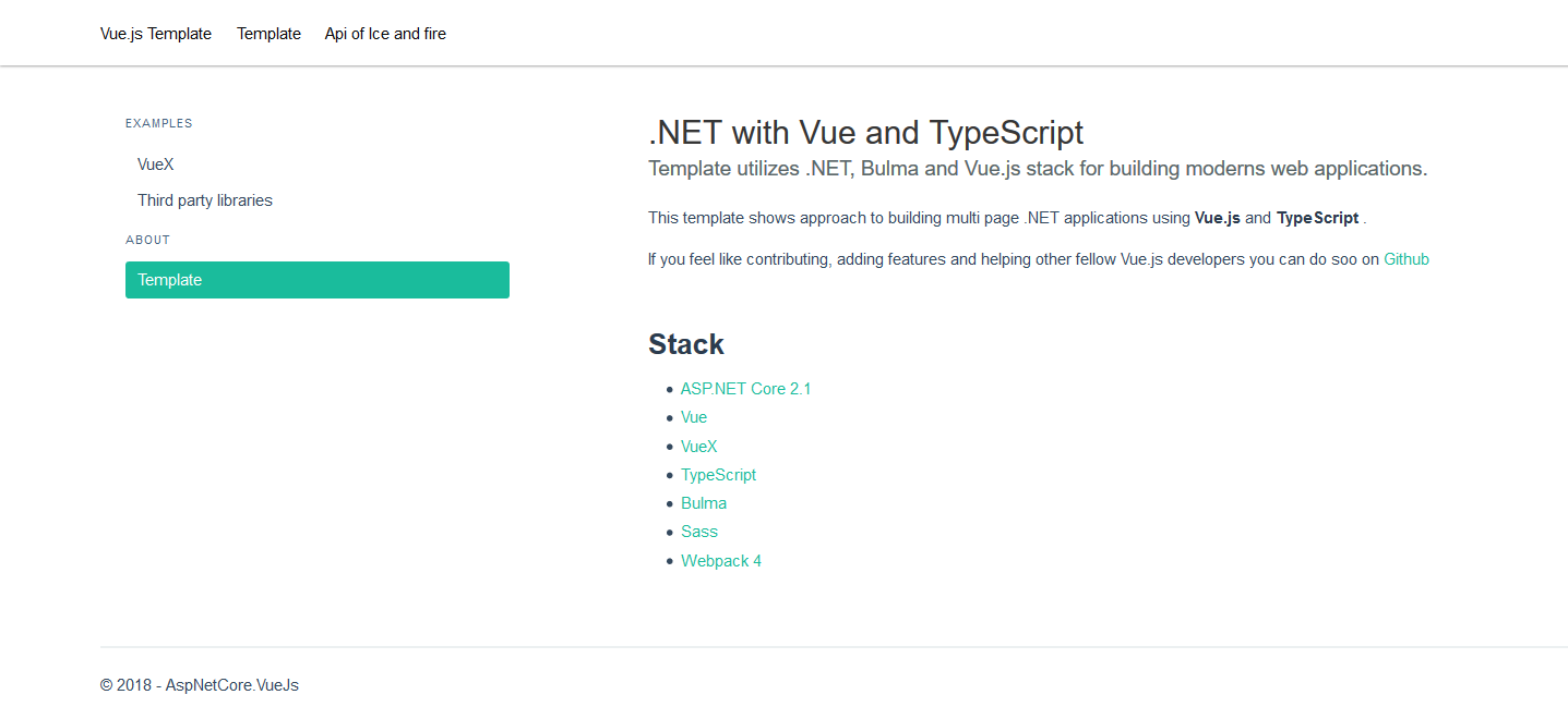 The repository contains template using Vue.js, Vuex, Vue router, TypeScript, Bulma and SASS. It integrates Vue into AspNetCore MVC and showcases how to use Vue with it's entire ecosystem in .NET as a multipage (multiple mini SPA's) application. The template can also be used as a complete single page application but you should consider using Vue cli for this as it is a more flexible and advanced solution.