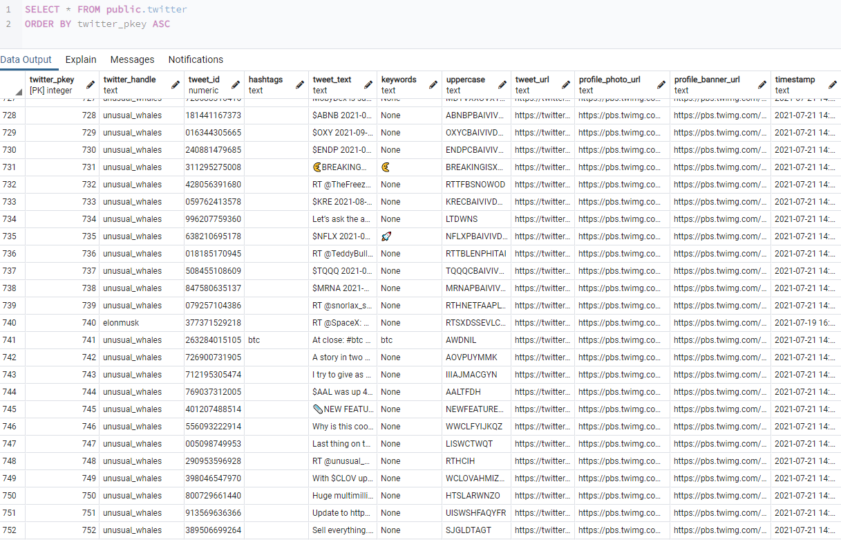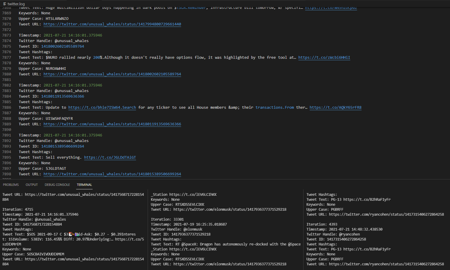 Results are displayed in the console, sent to Discord, logged to twitter.log, and a PostgreSQL database (optional). Comand line arguments can be supplied for username, table name, and to disable certain functionality. Twitter API key not required.