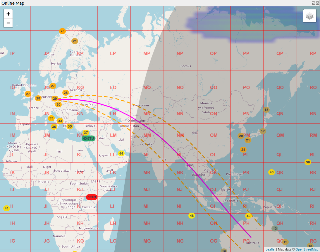 MUF - shows the Maximum Usable Frequency. It is the highest frequency that is expected to bounce off of the ionosphere on a path 3000km long. The data displays MUF with a maximum age of 45 minutes. If no current information is available, the point is not displayed.