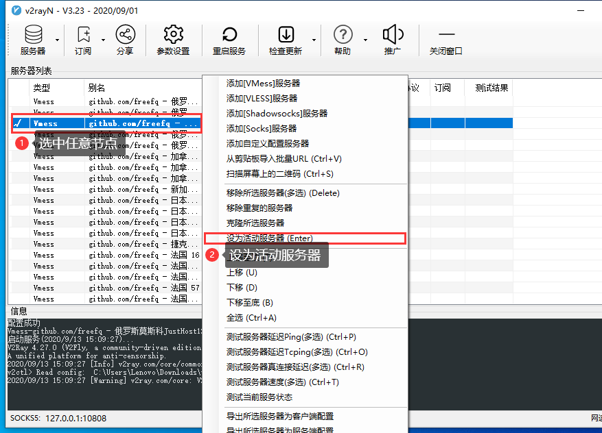 选择任一节点,单击右键->设为活动服务器,即启用该节点作为HTTP代理服务器。(也可以在左键点击节点名称以后按一下回车键,即Enter键)