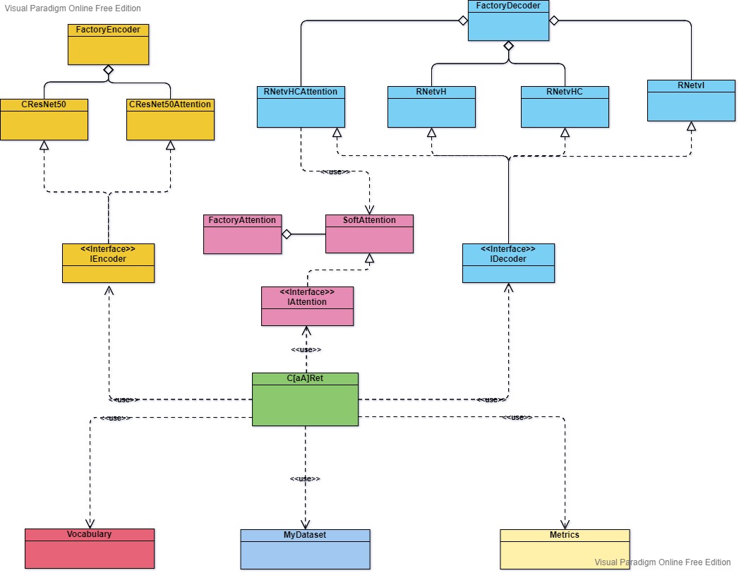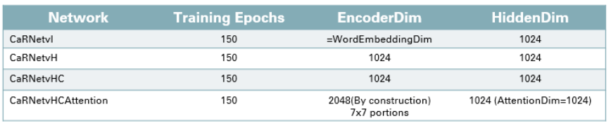 - RNetvHCAttention: The image context is placed in the hidden and cell state, and at each time step t a vectorial representation of the focus of attention is concatenated with the input of the LSTM.