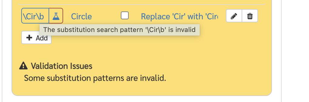 After you enter the invalid substitution patternEDIT for previously saved invalid substitutions, notice the feedback on the UI (see screenshot). Modify the incorrect substitution pattern to remove the red feedback box, and click the check mark to save the changes and observe the subsequent UI feedback.