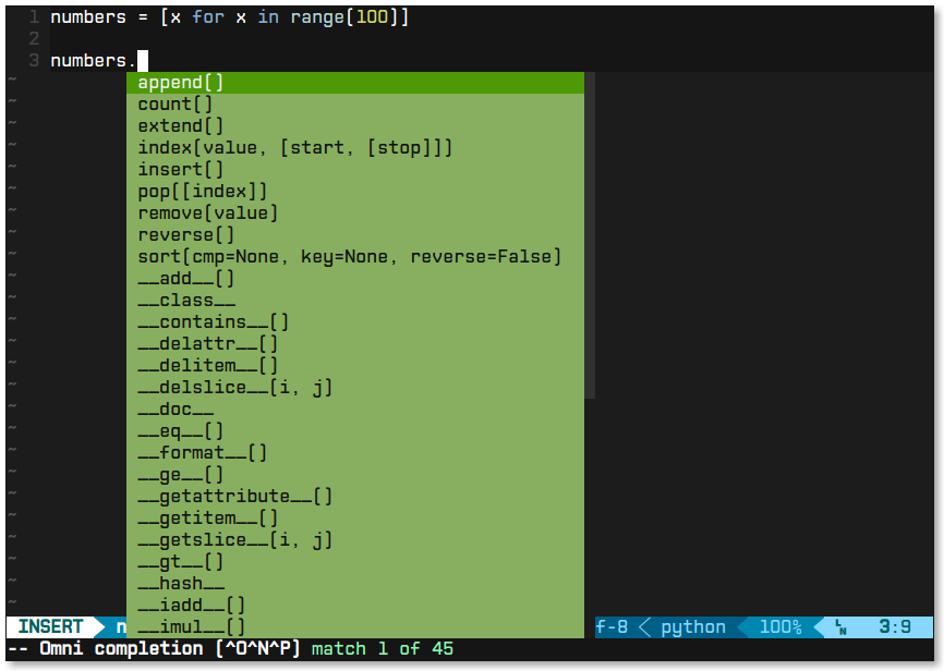 - Python mode (smarter autocompletion, smarter go to definition and find occurrences, better python indentation, doc, refactor utilities, lints and pep8 checkers, python motion and operators, better python highlighting, run python and ipdb breakpoints)