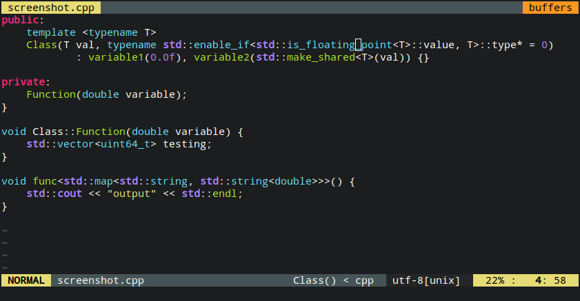 This file contains additional syntax highlighting that I use for C++11/14/17 development in Vim. Compared to the standard syntax highlighting for C++ it adds highlighting of (user defined) functions and the containers and types in the standard library / boost.
