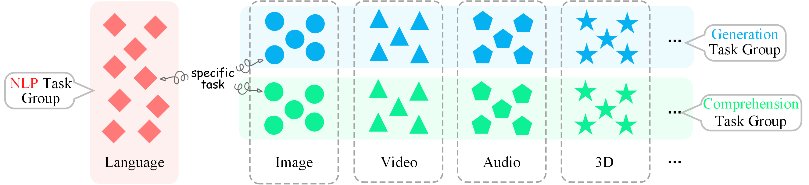 Achieving these levels of synergy becomes progressively more challenging, corresponding to higher degrees of general intelligence. Assume we have a benchmark of various modalities and tasks, where we can categorize tasks under these modalities into the Comprehension group and the Generation group, as well as the language (i.e., NLP) group, as illustrated here: