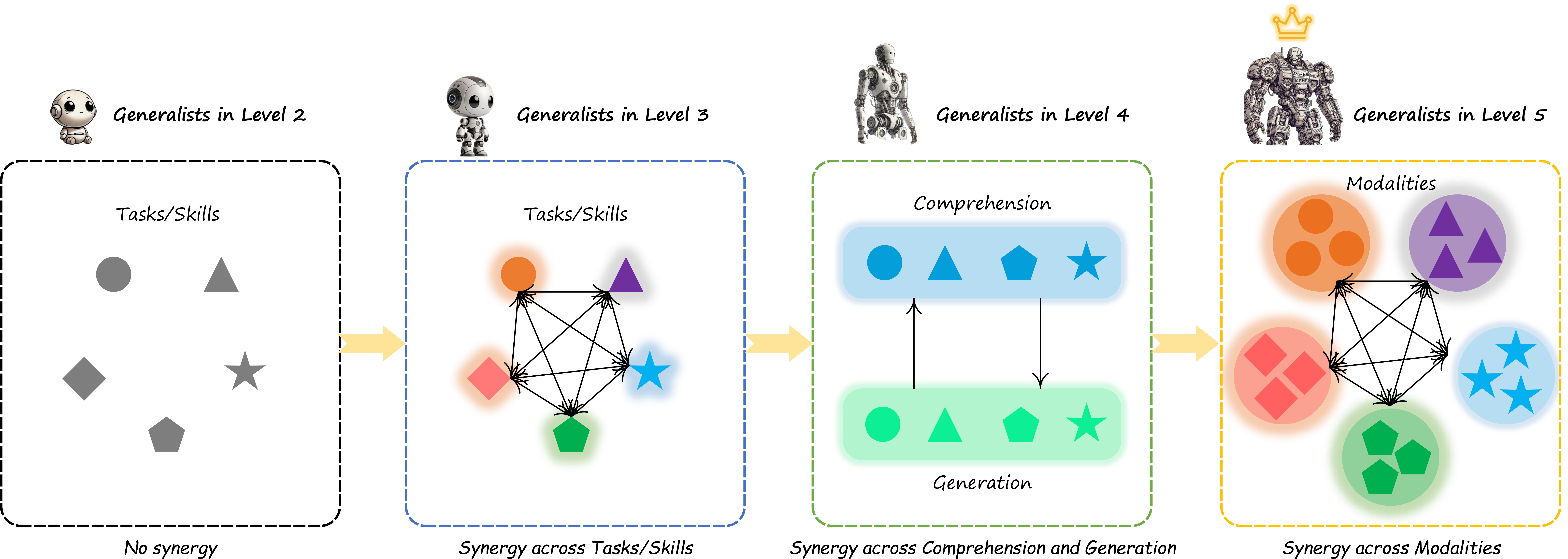 General-Level evaluates generalists based on the levels and strengths of the synergy they preserve. Specifically, we define three scopes of synergy, ranked from low to high: no synergy, task-level synergy ('task-task'), paradigm-level synergy ('comprehension-generation'), and cross-modal total synergy ('modality-modality'), as illustrated here: