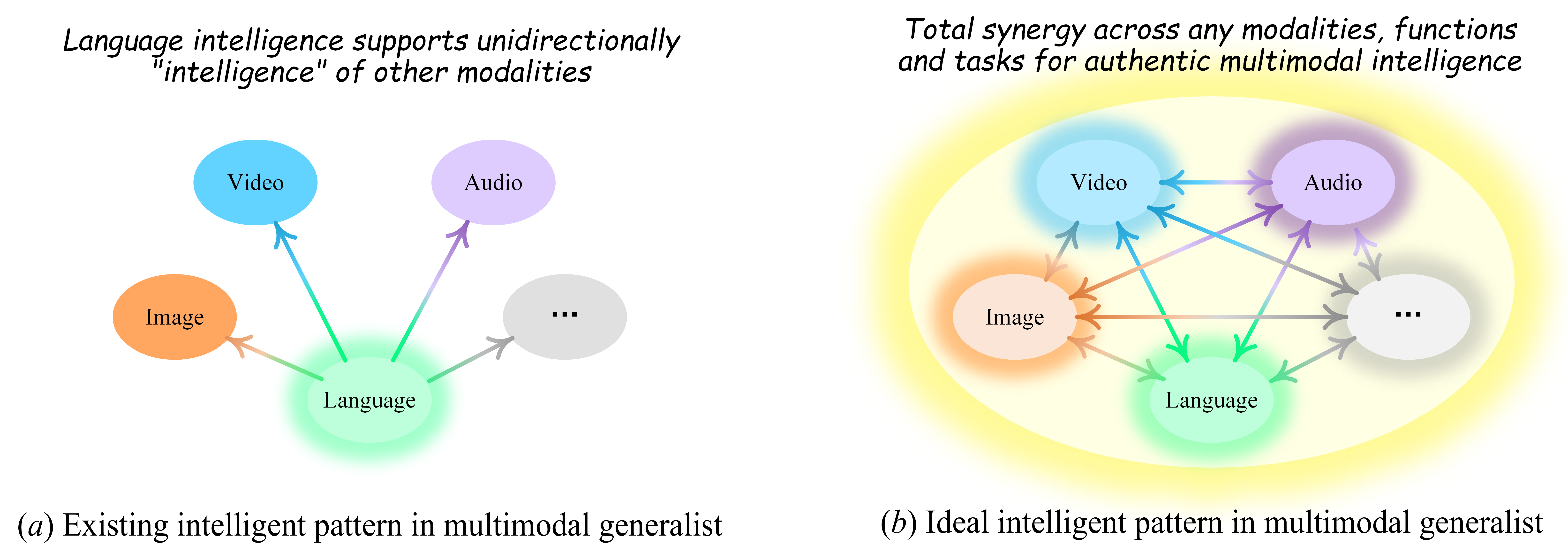 Most current MLLMs predominantly build on the language intelligence of LLMs to simulate the indirect intelligence of multimodality, which is merely extending language intelligence to aid multimodal understanding. While LLMs (e.g., ChatGPT) have already demonstrated such synergy in NLP, reflecting language intelligence, unfortunately, the vast majority of MLLMs do not really achieve it across modalities and tasks.