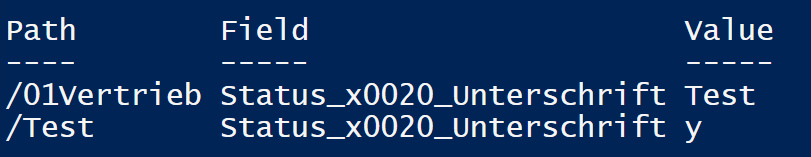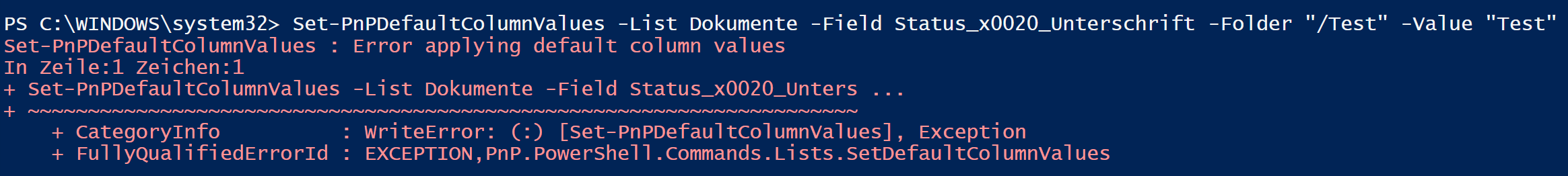 Set-PnPDefaultColumnValues -List Dokumente -Field Status_x0020_Unterschrift -Folder "Test" -Value "Test"