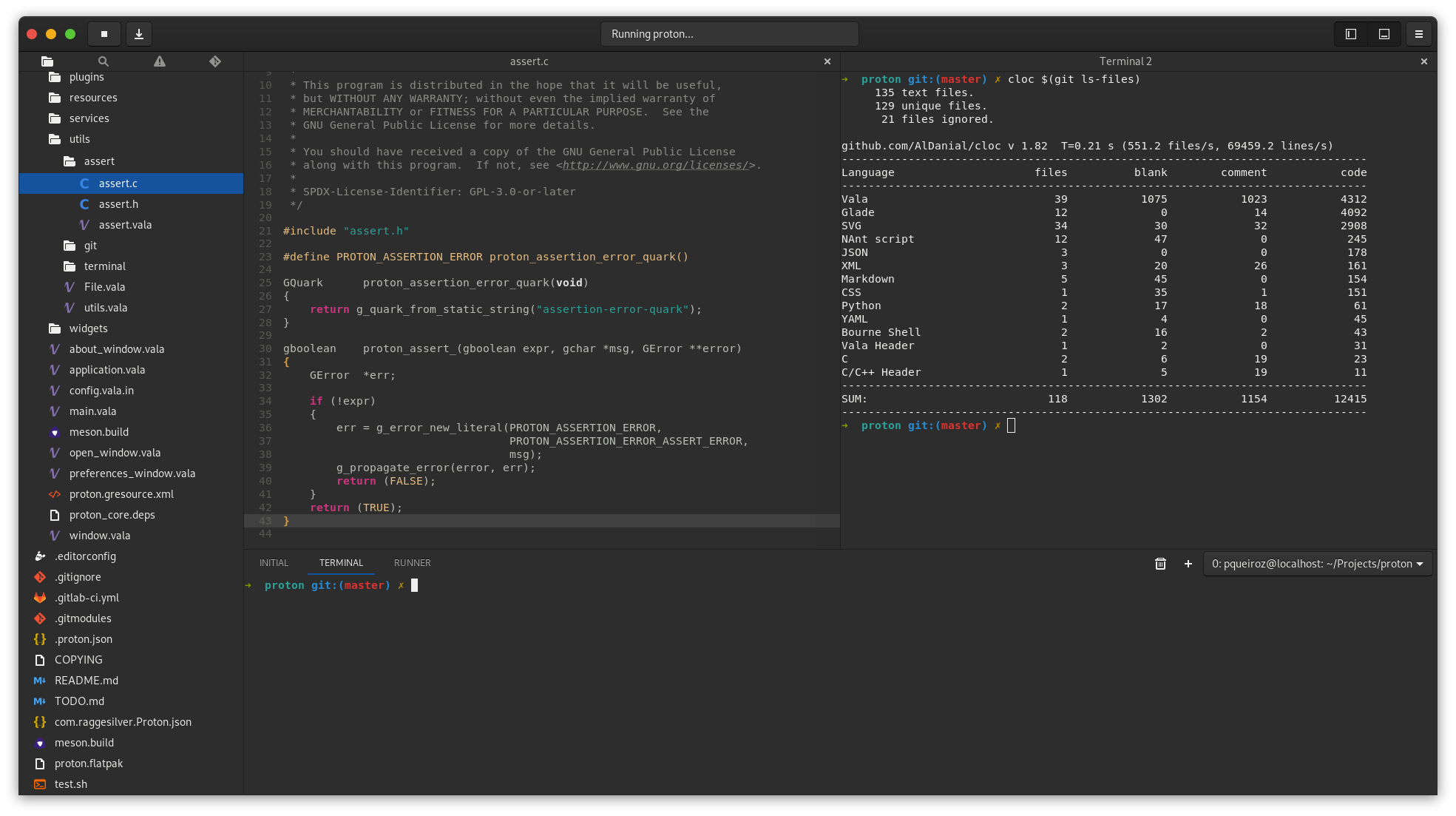 Proton can be run on GNOME Builder. If you have Proton 0.1.8+ you can also run Proton on Proton 😜️. (for either one just press play and behold magic)