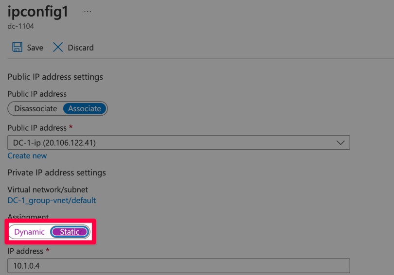 - To ensure DC-1 always has the same internal IP address, set its Virtual Network Interface Card (vNIC) to use a static private IP: