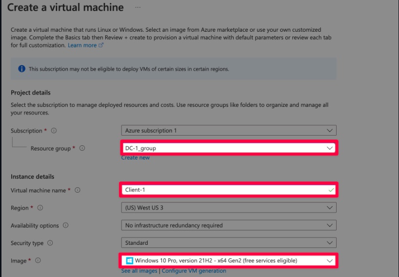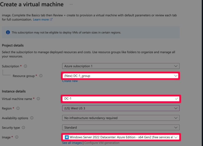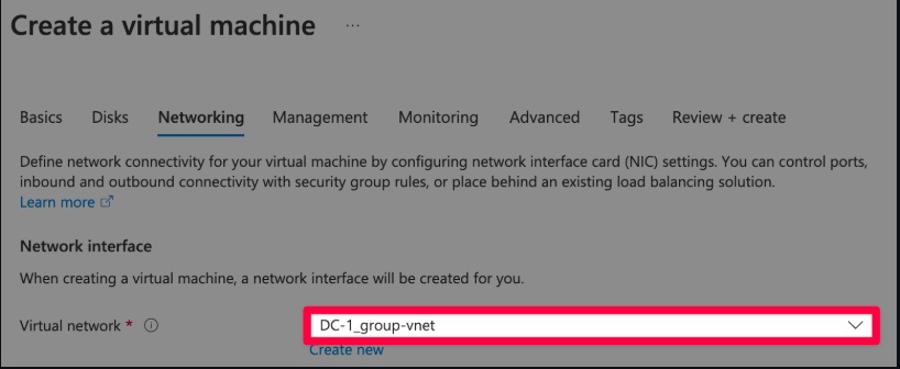 Make sure to select the same Resource Group and Virtual Network (vNet) as DC-1