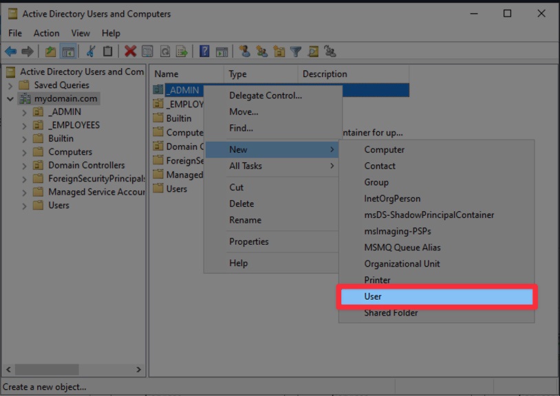 Right-click the _ADMINS OU, then select New > User.