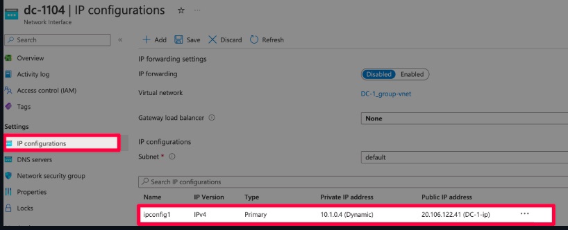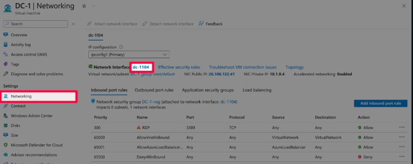 Go to DC-1’s page in the Azure portal