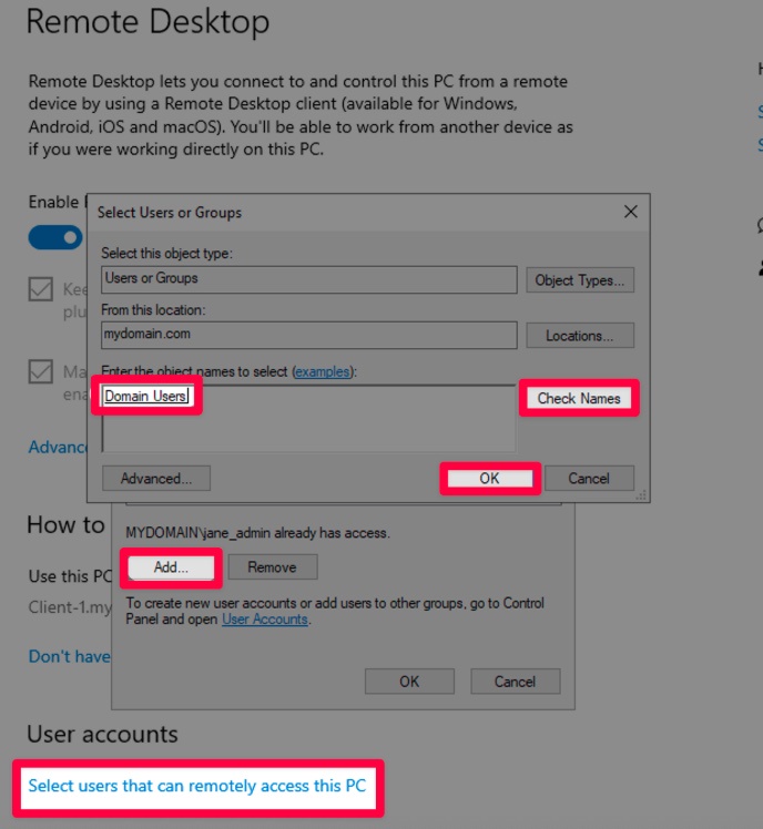 Type in the name(s) of the domain user(s) you want to allow remote access.