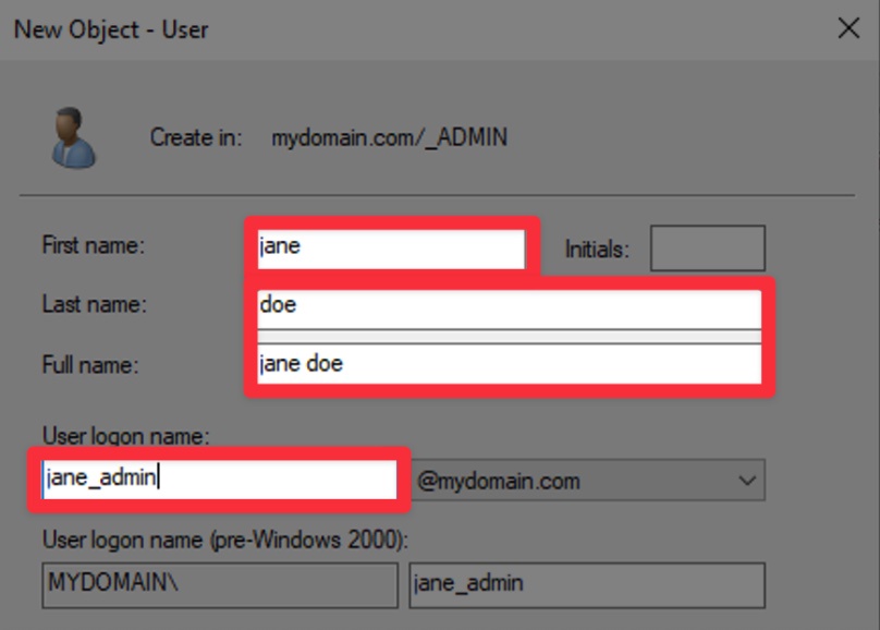 This adds Jane Doe as a user in the _ADMINS OU with the login name jane_admin.