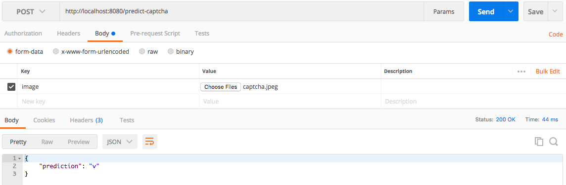 - In response you will get predicted letter from given captcha image.