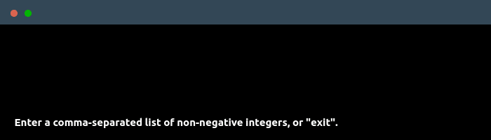 putStrLn "Enter a comma-separated list of non-negative integers, or \"exit\"."