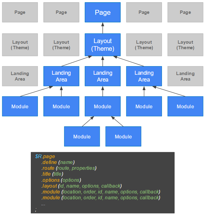 - Layouts (same as modules but used to describe page layout with areas for modules placements);