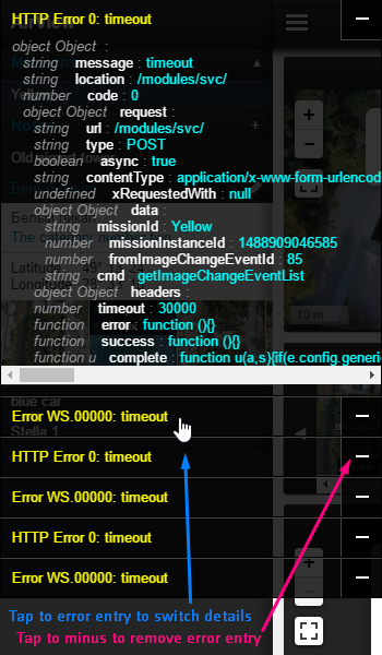 RockJS log will be presented as a list of entry titles. Any entry can be expanded or collapsed by tapping to the title of entry. Tapping to the "minus" button that located in the top-right corner of any entry reveal to removing of entry from list.